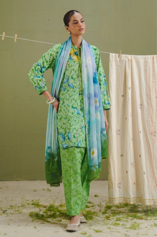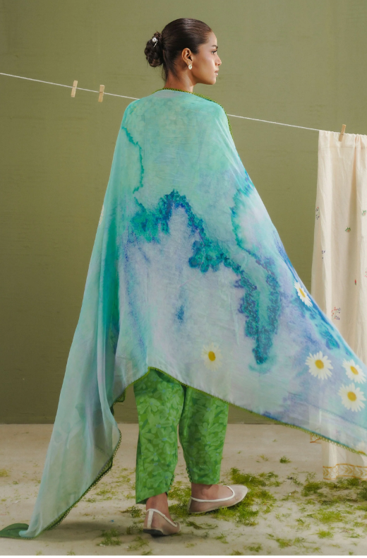 The dupatta presents daisy florals with a watercolor-textured effect in aqua marine tones. The shirt and trouser are printed with daisy meadow inspired motifs on a pear green base.