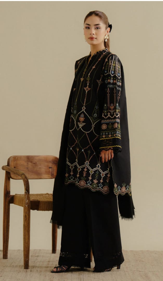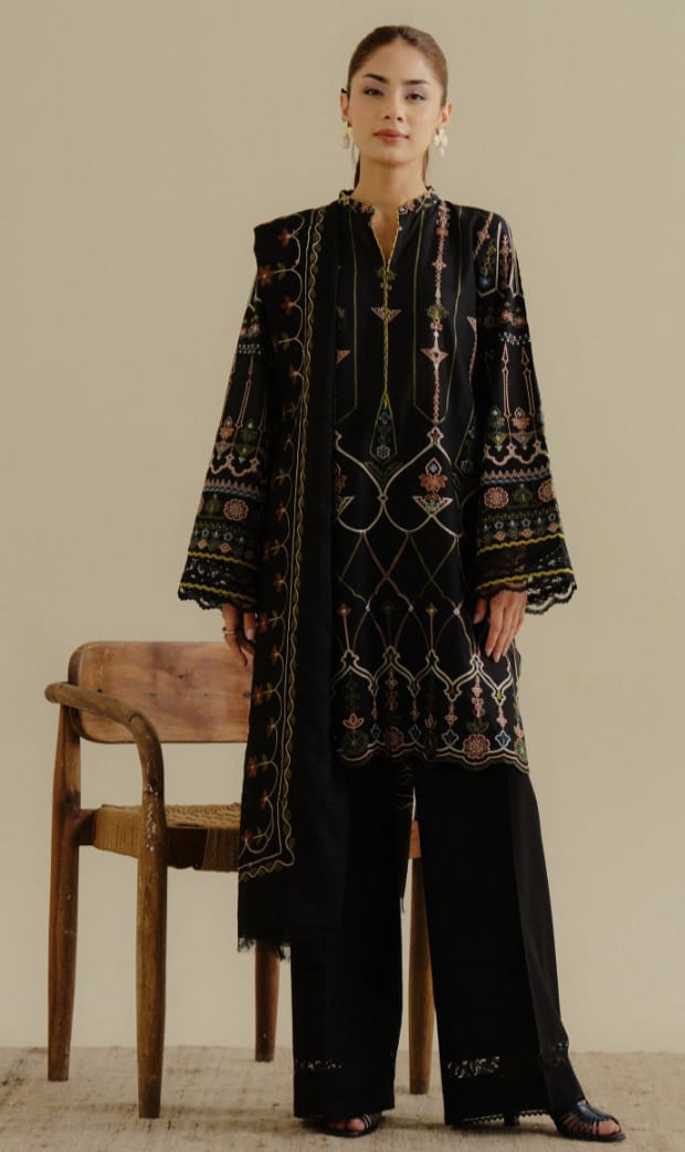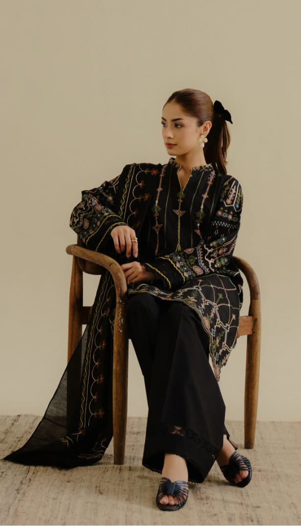 A deep black ensemble brought to life with bold, vibrant embroidery in striking solid tones — a crisp, standout summer statement.